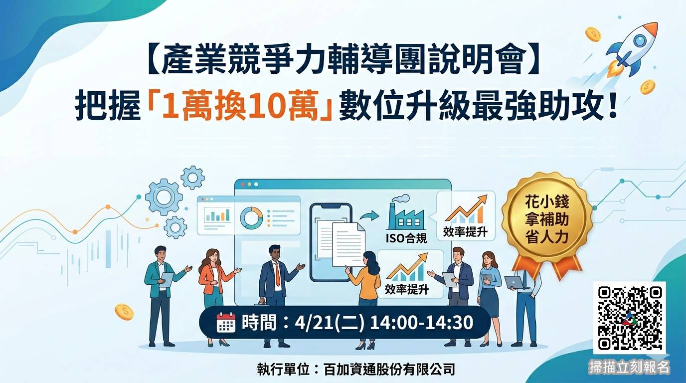 【活動快訊】產業競爭力輔導專案:4/21 數位轉型說明會,首波導覽影片同步釋出! 2026 製造業數位轉型首選!百加資通協助申請『產業競爭力輔導團』專案,提供 1 萬換 10 萬的高額數位工具補助。4/21 線上說明會將詳解 AI 流程自動化與無紙化簽核應用,文內附首波導覽影片。立即掌握政府資源,解決企業人力缺口,強化智造競爭力! 2026-04-10
